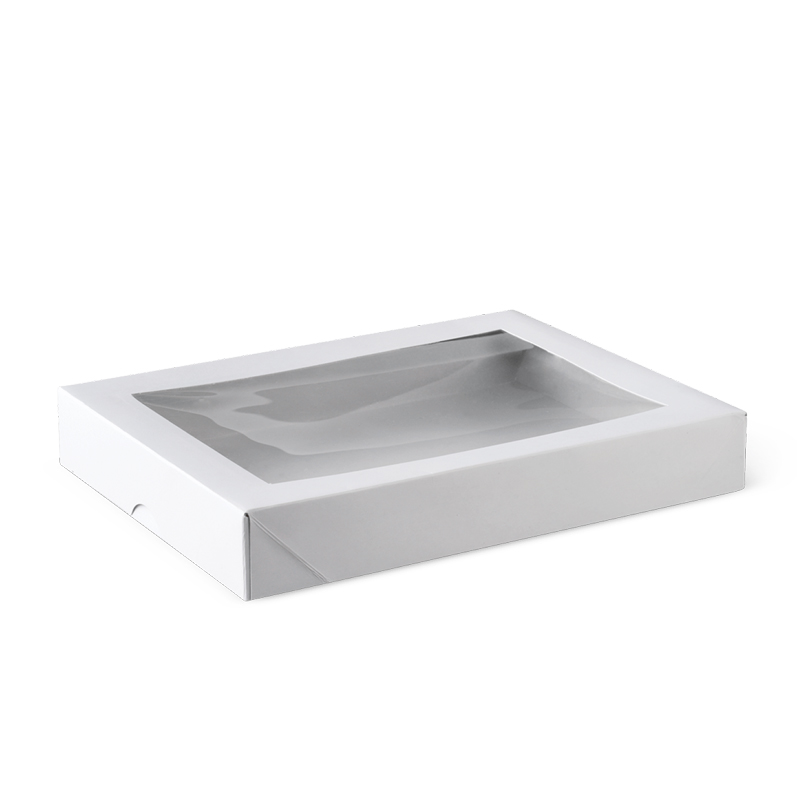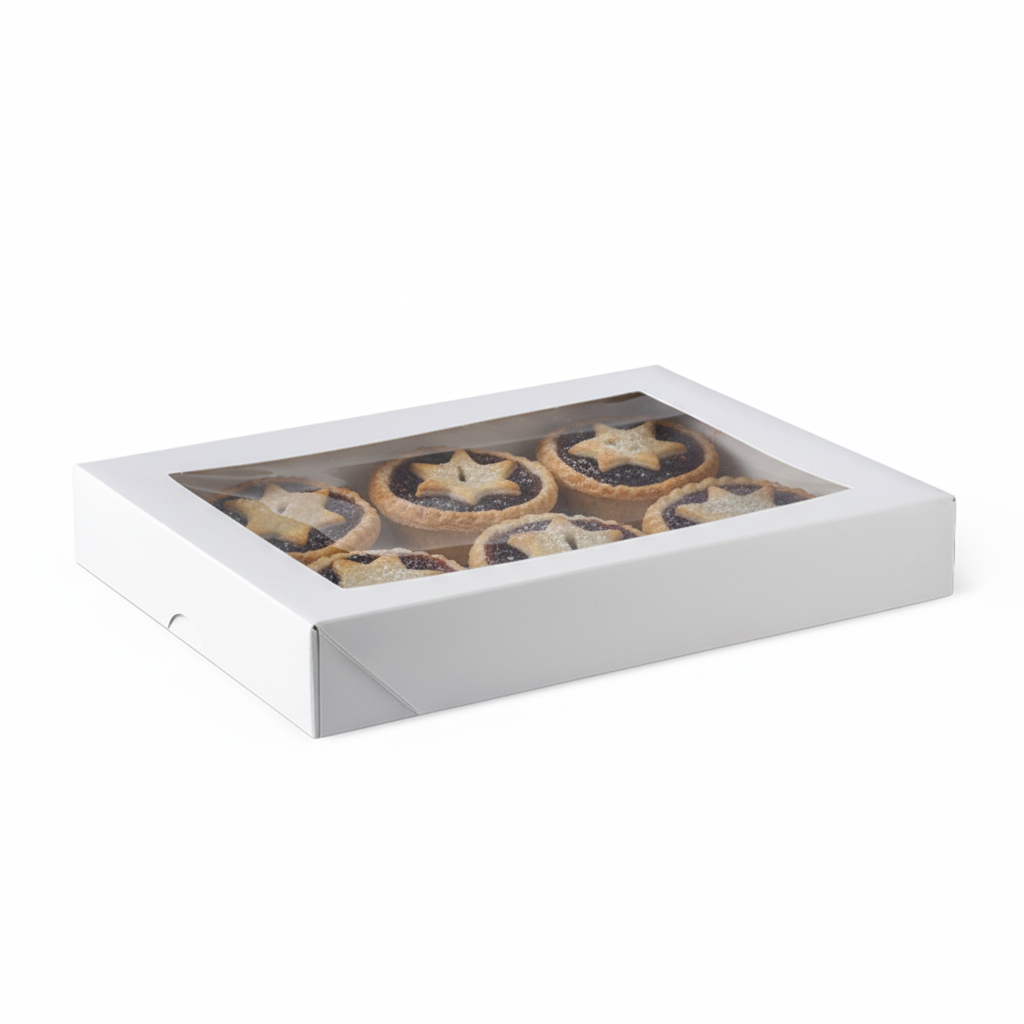 The Shallow Window Cake Box offers an elegant and practical way to present baked goods, desserts, and pastries. Featuring a clear window lid, it allows customers to view the contents while keeping them fresh and protected. Ideal for showcasing cakes, tarts, slices, and sweet treats, this flat, long patisserie-style box is made from sturdy food-grade board with a stylish white finish. Its low-profile design makes it perfect for fruit mince pies, catering trays, and delicate baked goods that deserve a premium presentation.