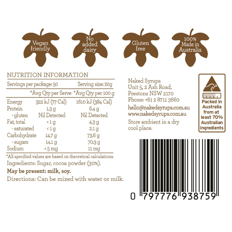 Naked Syrups Chocolate Powder 30% Cocoa 1kg is a premium beverage powder made from high-grade African cocoa. It delivers a rich, balanced chocolate flavour that works well in both hot and cold drinks. This Australian-made powder is vegan certified and gluten free, making it suitable for a wide range of customers.