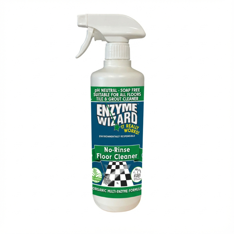 Enzyme Wizard No Rinse Floor Cleaner Spray Bottle 1L is a labelled empty bottle designed for refilling from the Enzyme Wizard No Rinse Floor Cleaner 5L bulk container. It features pre printed product identification and usage instructions, ensuring safe and compliant use across commercial cleaning environments.