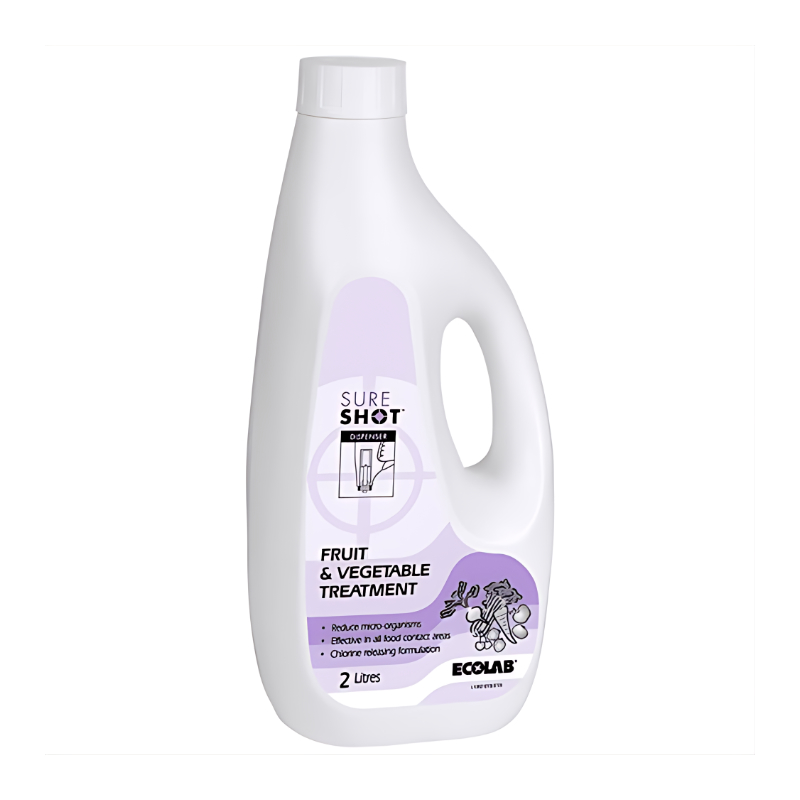 Sureshot Fruit and Vegetable Treatment 2L is a concentrated sanitising solution designed to effectively wash and treat fresh produce in commercial foodservice environments. Developed by Ecolab, this professional grade formula helps reduce bacteria and contaminants on fruit and vegetables, supporting safer food preparation and improved hygiene standards.