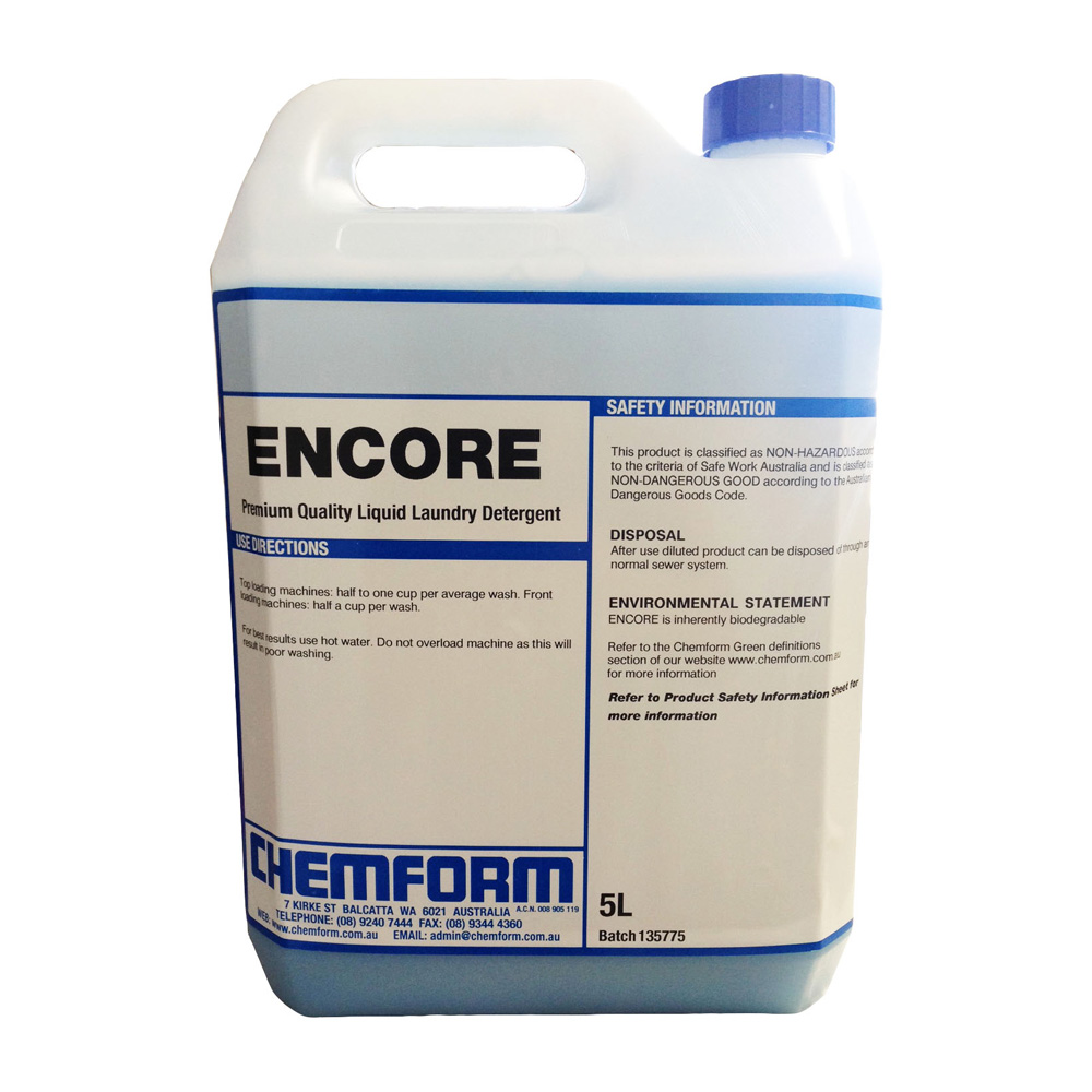 Use half to one cup per average domestic top-loading washing machine. For front-loading machines, use half a cup per load. Wool should not be washed in Encore, as damage will result; for wool washing use Protein. Do not over load the machine as this will result in poor washing. For best results use hot water.