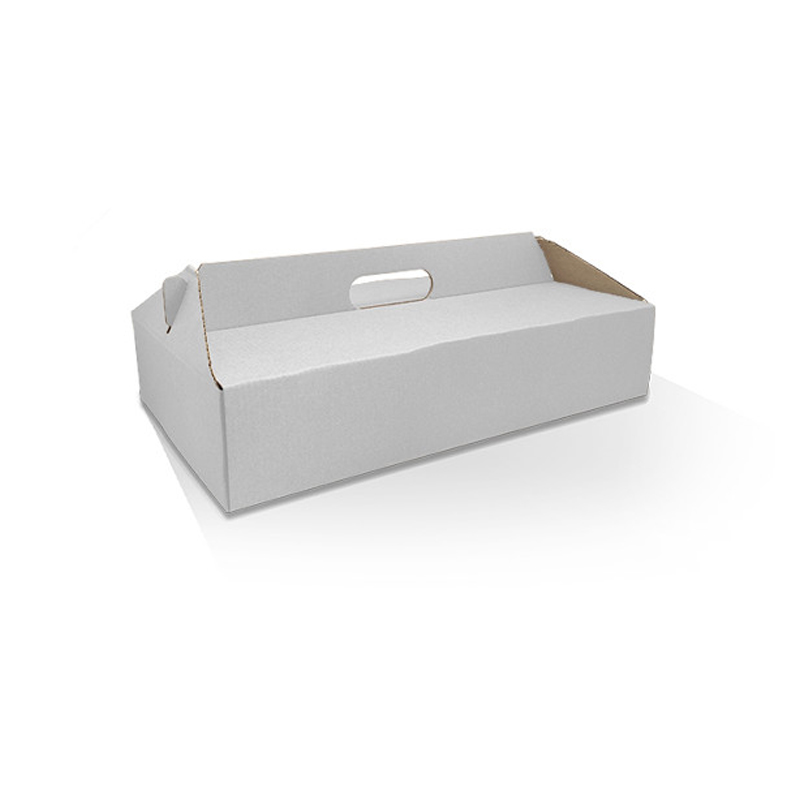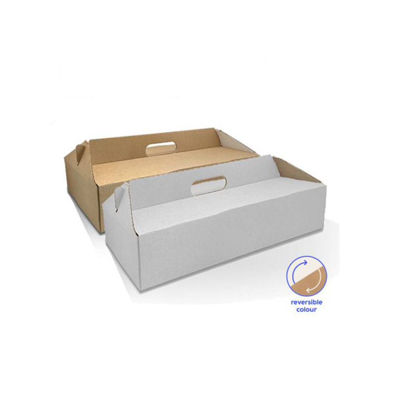 The Pack N Carry Large Catering Box provides a spacious, sturdy, and visually flexible packaging solution for larger catering presentations. Made from heavy-duty corrugated board, the box features a reversible design that allows you to present it in either kraft brown or white, depending on your preferred look. This large-format box is ideal for grazing platters, sandwich selections, baked goods, trays, and event catering packs. Strong built-in handles ensure safe and comfortable carrying, while the robust construction protects contents during transit. Supplied flat-packed and fully recyclable, it delivers a premium and adaptable packaging option for caterers, bakeries, cafés, and event organisers.